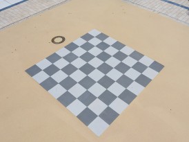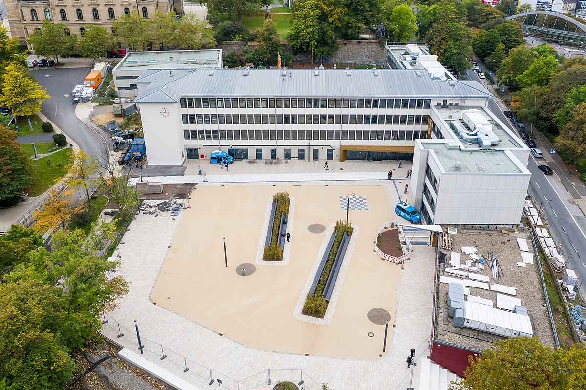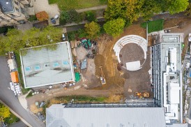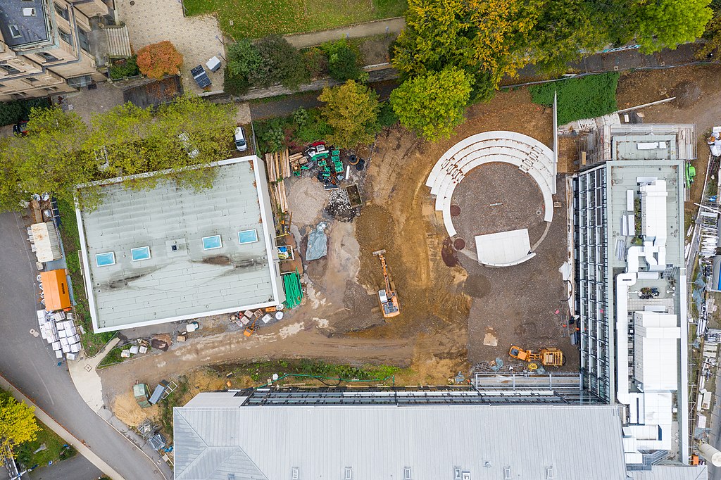 Neugestaltung der Außenbereiche: Bewegungsförderung (Fuß- und Basketball, Tischtennis, Boulderwand), Theatron, Sitzgruppen, im Sommer Öffnung des Cafés nach draußen, Ruhezonen, Schulgarten, Außenschach ….