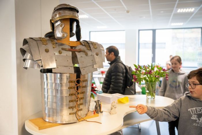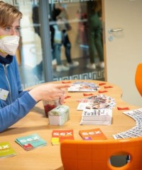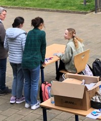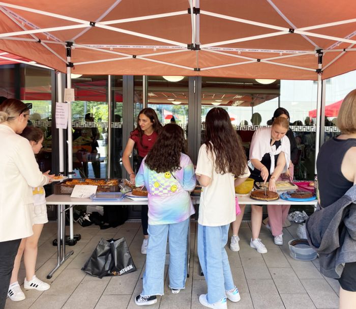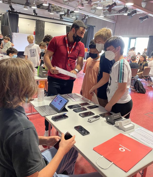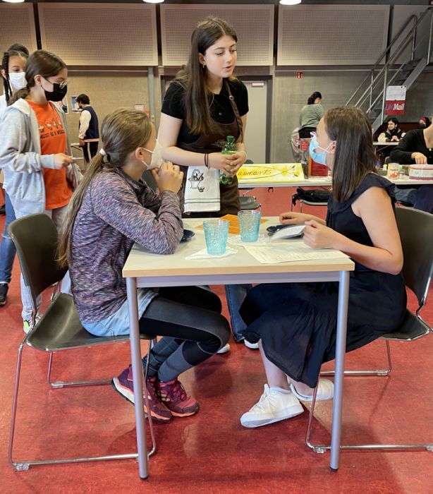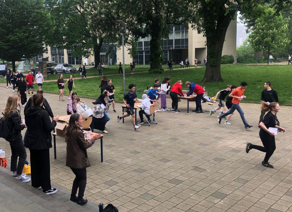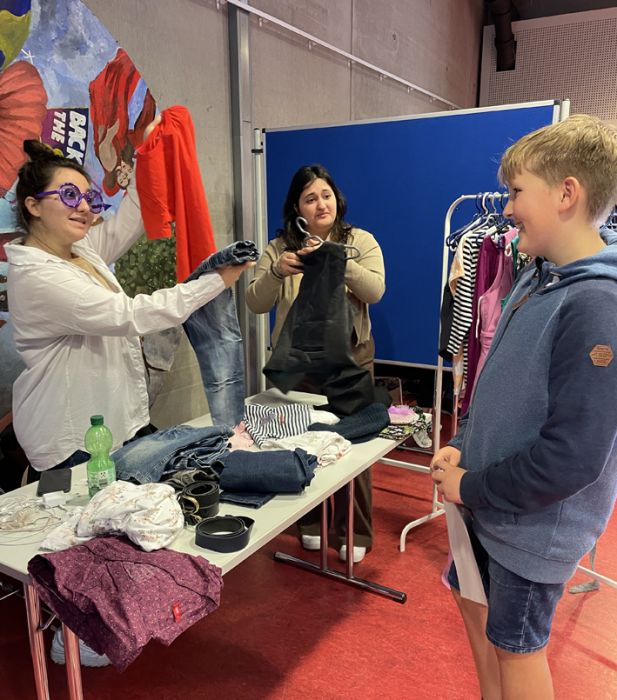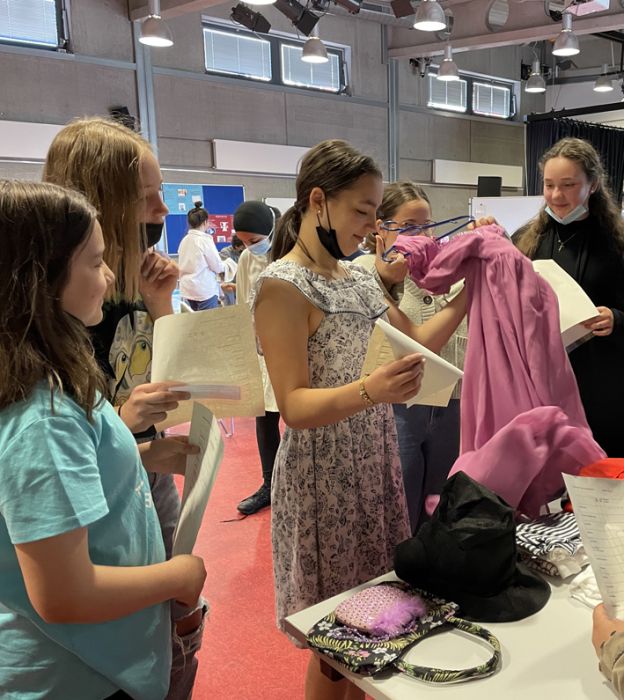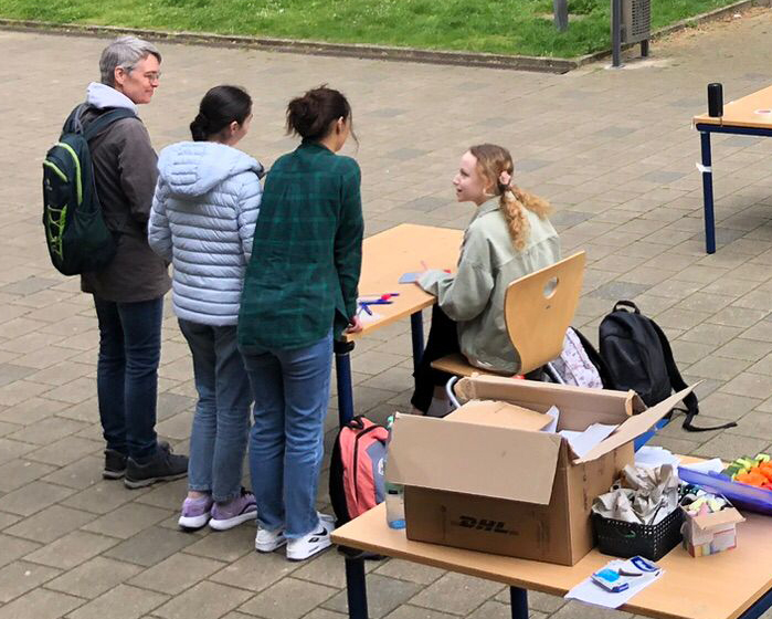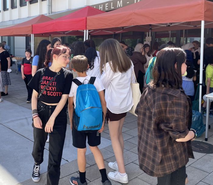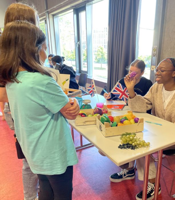 Die Schülerinnen und Schüler der Englisch Leistungskurse begrüßten dort die Mitschülerinnen und Mitschüler der Klasse 6 an verschiedenen Stationen, in denen lebensweltliche und authentische Handlungssituationen erprobt werden konnten – in English only: buche ein Hotelzimmer, lass‘ den Akku deines Handys austauschen, iss etwas im Restaurant oder kaufe ein spannendes Kleidungsstück.