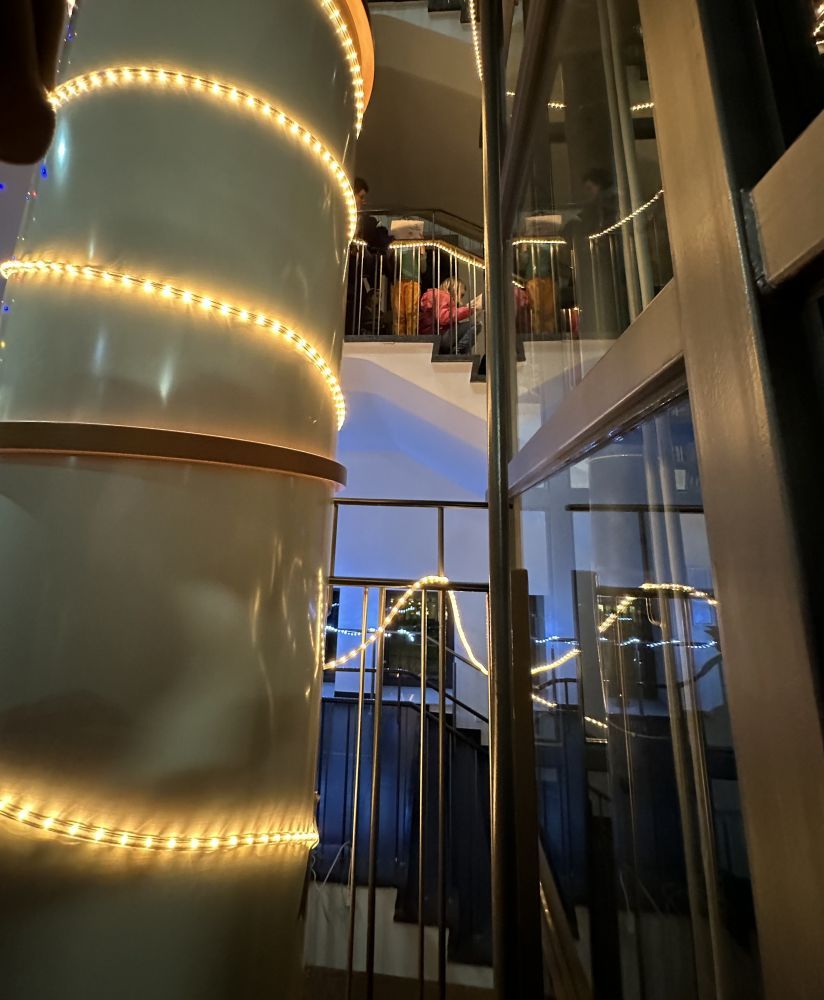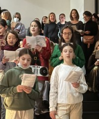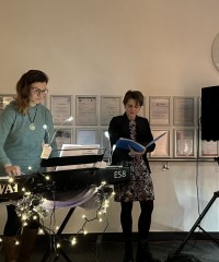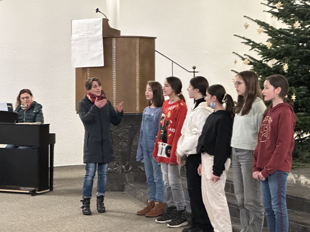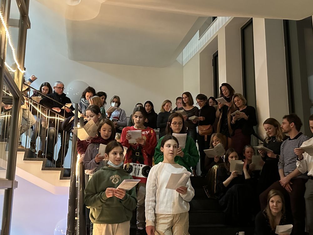 Von unserer Hausmeisterin wurde das Treppenhaus zu diesem Anlass mit Lichterketten geschmückt und unser Schulchor sang unter der Anleitung von Frau Schenk und Frau Richter festliche internationale Weihnachtslieder.